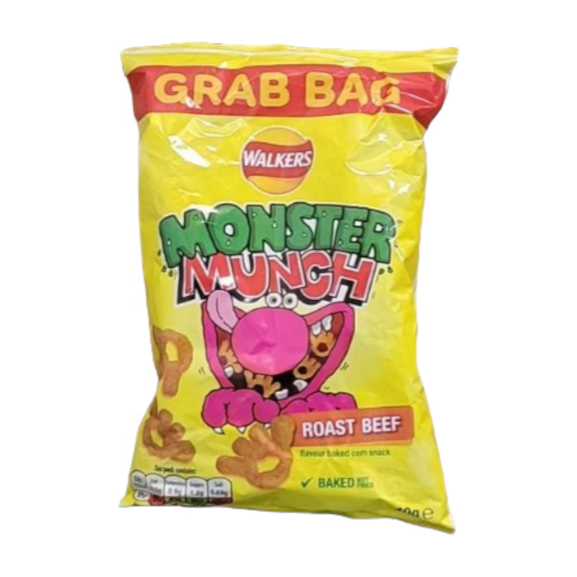 Indulge in a pack of Mega Monster Munch Grab Bag in delicious Roast Beef flavor. Let the monster crunch of these savory chips satisfy your taste buds with every bite. Made with real roast beef, these chips will offer a flavorful and satisfying snack experience.